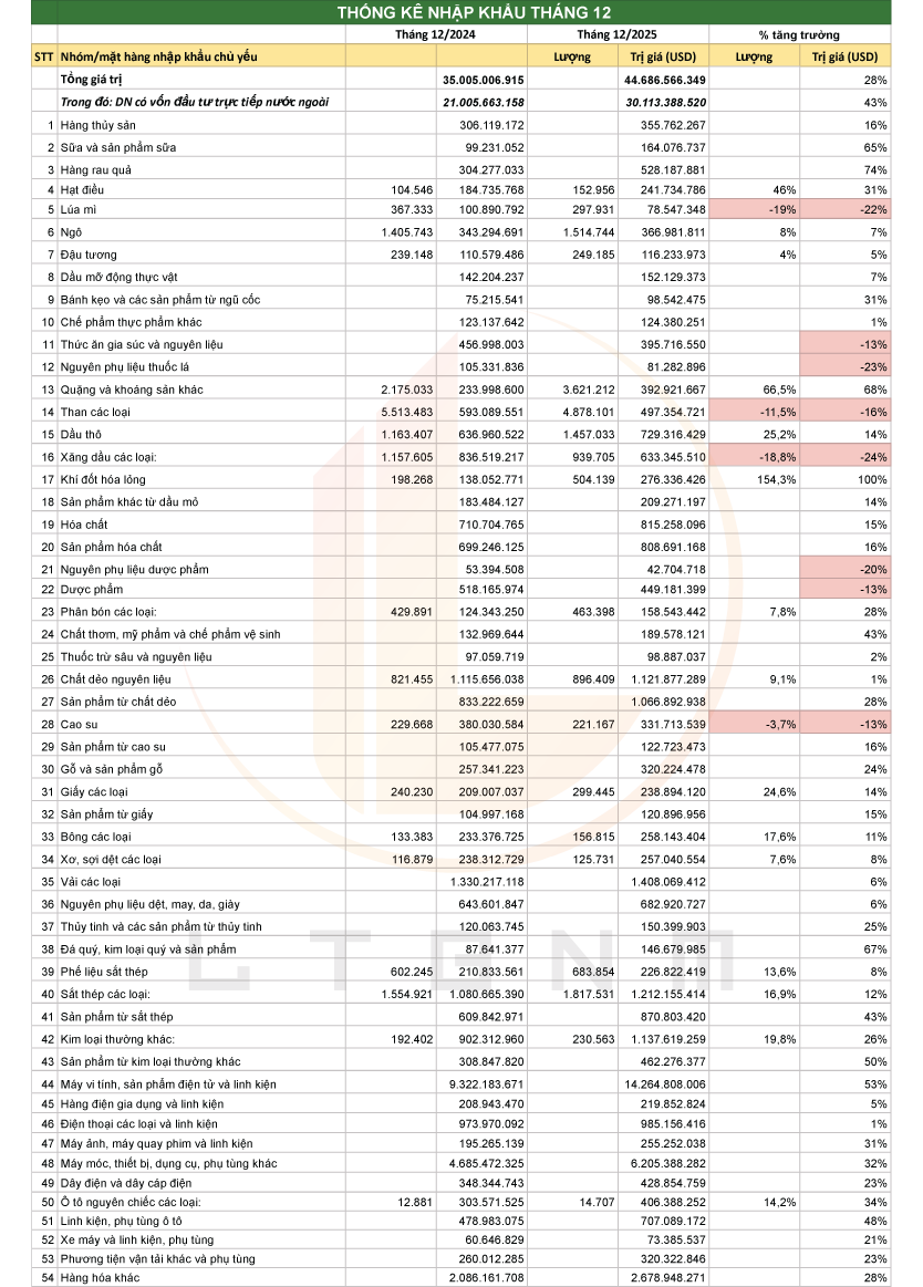 Tổng giá trị nhập khẩu đạt 44,7 tỷ đô – tăng lên mức 28% so với cùng kỳ. Top những mặt hàng tăng trưởng là: Khí đốt hóa lỏng (+100% yoy), Hàng rau quả (+74% yoy), Quặng và khoáng sản khác (+68% yoy). Những mặt hàng giảm mạnh về giá trị là: Xăng dầu các loại: (-24% yoy), Nguyên phụ liệu thuốc lá (-23% yoy), Lúa mì (-22% yoy).