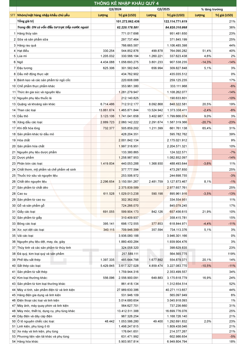 Tổng giá trị nhập khẩu đạt 122.1 tỷ đô – tăng lên mức 21% so với cùng kỳ. Top những mặt hàng tăng trưởng là: Đá quý, kim loại quý và sản phẩm (+119% yoy), Sản phẩm từ kim loại thường khác (+52% yoy), Hàng rau quả (+44% yoy). Những mặt hàng giảm mạnh về giá trị là: Xăng dầu các loại (-23% yoy), Ngô (-14% yoy), Dược phẩm (-14% yoy).