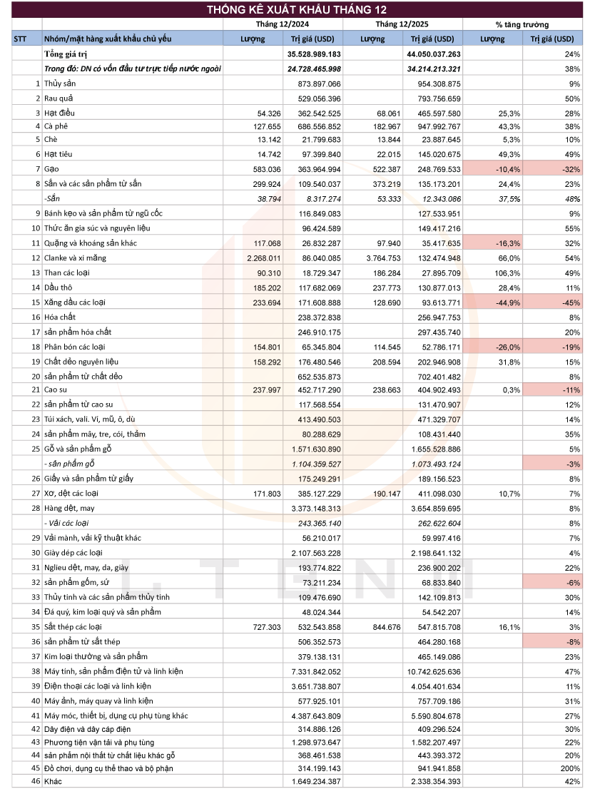 Trong tháng 12, tổng giá trị xuất khẩu đạt 44 tỷ đô – tăng 24% yoy. Những mặt hàng ghi nhận giá trị xuất khẩu cao trong tháng là: Đồ chơi, dụng cụ thể thao và bộ phận (+200% yoy), Thức ăn gia súc và nguyên liệu (+55% yoy), Clanke và xi măng (+54% yoy). Những mặt hàng giảm về giá trị xuất khẩu mạnh nhất: Xăng dầu các loại (-45% yoy), Gạo (-32% yoy), Phân bón các loại (-19% yoy).