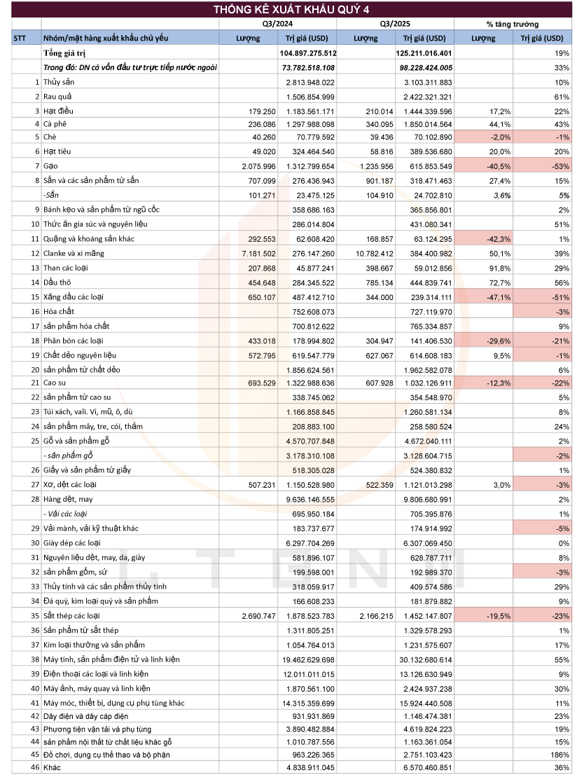 Trong Quý 4, tổng giá trị xuất khẩu đạt 125.2 tỷ đô – tăng 19% yoy. Những mặt hàng ghi nhận giá trị xuất khẩu cao trong tháng là: Đồ chơi, dụng cụ thể thao và bộ phận (+186% yoy), Rau quả (+61% yoy), Dầu thô (+56% yoy). Những mặt hàng giảm về giá trị xuất khẩu mạnh nhất: Gạo (-53% yoy), Xăng dầu các loại (-51% yoy), Sắt thép các loại (-23% yoy).