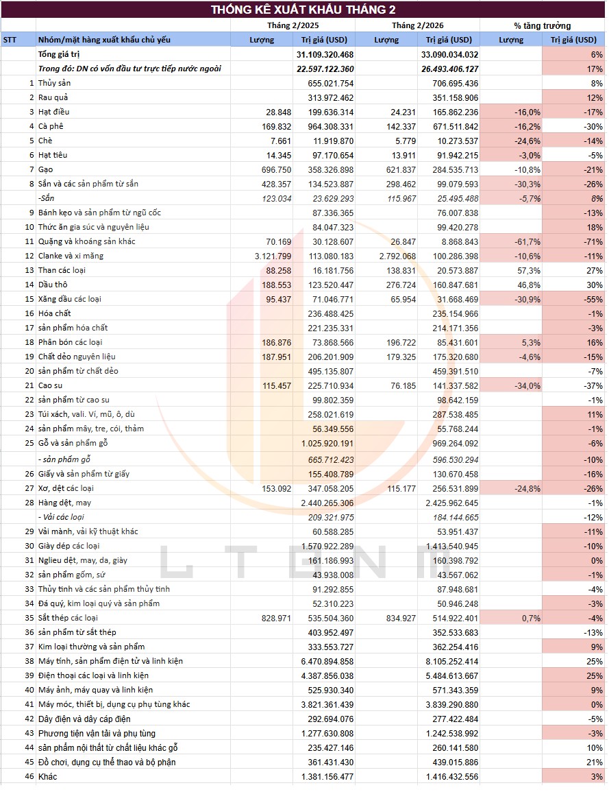 Trong tháng 1 và tháng 2, tổng giá trị xuất khẩu đạt 76,3 tỷ đô – tăng 19% yoy. Những mặt hàng ghi nhận giá trị xuất khẩu cao trong tháng là: Sắn (+86% yoy), Thức ăn gia súc và nguyên liệu (+62% yoy), Đồ chơi, dụng cụ thể thao và bộ phận (+52% yoy). Những mặt hàng giảm về giá trị xuất khẩu mạnh nhất: Xăng dầu các loại (-62% yoy), Quặng và khoáng sản khác (-45% yoy), Dầu thô (-43% yoy).