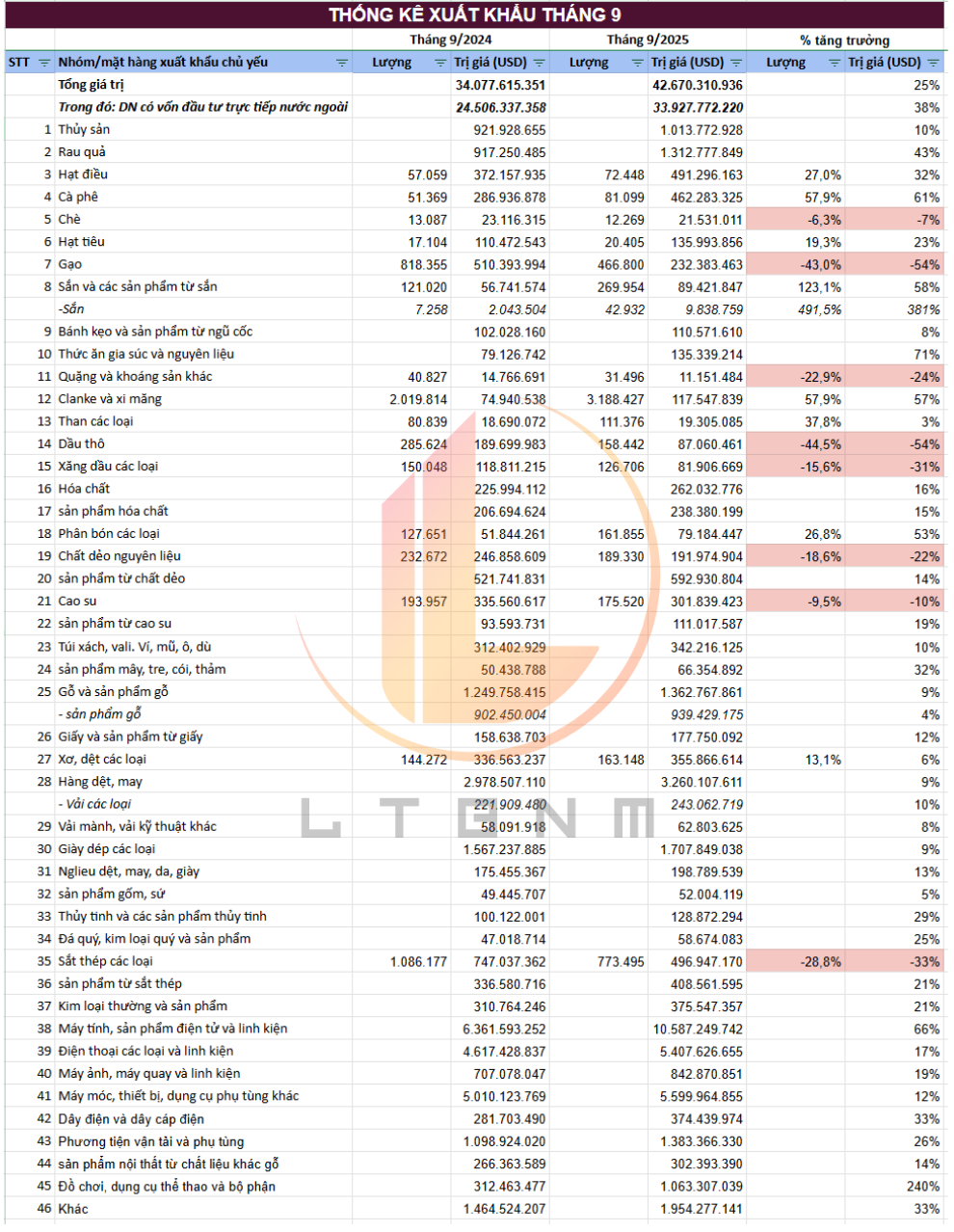 Trong tháng 9, tổng giá trị xuất khẩu đạt 42,6 tỷ đô – tăng 25% yoy. Những mặt hàng ghi nhận giá trị xuất khẩu cao trong tháng là: Sắn (+381% yoy), Đồ chơi, dụng cụ thể thao và bộ phận (+240% yoy), Thức ăn gia súc và nguyên liệu (+71% yoy). Những mặt hàng giảm về giá trị xuất khẩu mạnh nhất: Gạo (-71% yoy), Dầu thô (-54% yoy), Sắt thép các loại (-33% yoy).