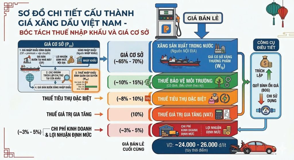 • Dư địa giảm thuế: Các loại thuế như thuế bảo vệ môi trường, thuế tiêu thụ đặc biệt vẫn chưa hạ, đây là công cụ dự phòng để kéo giá xăng xuống nếu giá dầu thế giới tiếp tục căng thẳng.