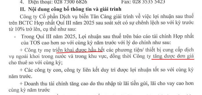 TOS đã công bố BCTC Q3 tăng trưởng rất mạnh khi doanh thu tăng 61.7% yoy lên 1,358 tỷ đồng. Lợi nhuận sau thuế đạt 308 tỷ đồng, tăng 218% yoy. Đáng chú ý doanh thu và lợi nhuận gộp đến từ mảng kinh doanh chính chứ không phải các khoản đột biến khác. Biên lợi nhuận gộp cũng được cải thiện từ 23.3% lên 35% trong Q3-2025.