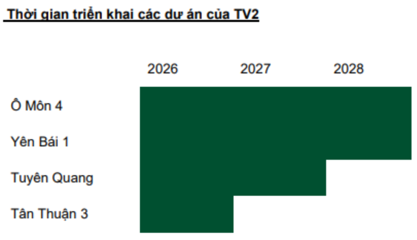 Có thể thấy, từ nay đến tối thiểu 2028, TV2 sẽ liên tục có các dự án lớn gối đầu, lượng backlog sẽ gia tăng theo bước đi của QHĐ8 trong thời gian tới. Để tiện theo dõi, chúng tôi liệt kê trực quan về thời gian triển khai các dự án của TV2 trong giai đoạn tới. (Hình 3)