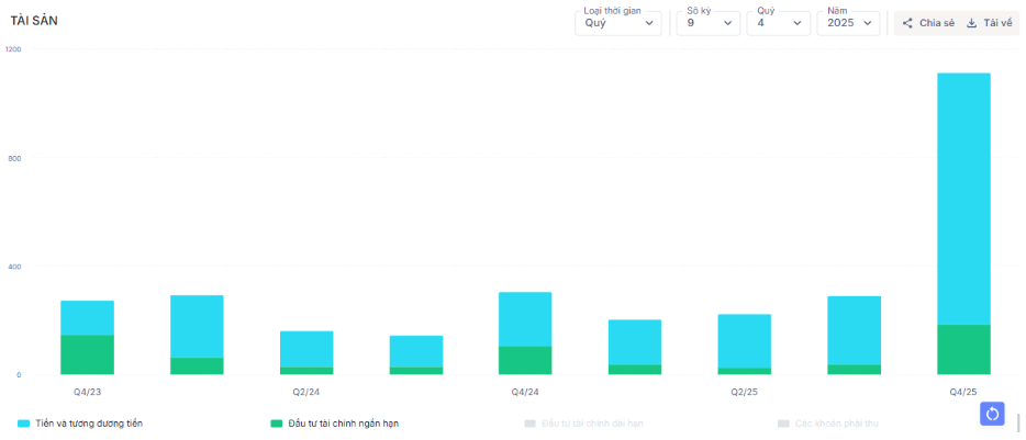 Trong kỳ, doanh thu tài chính ghi nhận 6,9 tỷ đồng – tăng nhẹ 5% so với cùng kỳ. Đây là kết quả của việc TV2 ghi nhận khoản tiền bắt đầu tăng từ Q3/25. Chi phí tài chính trong quý ghi nhận 1,8 tỷ đồng, trong đó chi phí lãi vay đã giảm 37% yoy chỉ còn hơn 1 tỷ đồng. Trong bối cảnh lãi suất tăng thì việc tăng lượng tiền đi gửi và giảm nợ vay sẽ giúp TV2 giảm bớt gánh nặng tài chính.
