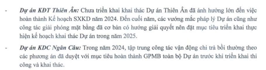 – Dự án BDS thì không quá lớn và thực hiện kéo dài nhiều năm vẫn dính tới GPMB chưa được ổn thỏa nên kiểu này thường sẽ làm dần dần hoặc delay khó dự đoán chính xác được thời điểm kinh doanh. Trong 2025 có thể vẫn sẽ được hạch toán một phần từ dự án Thiên Ân.