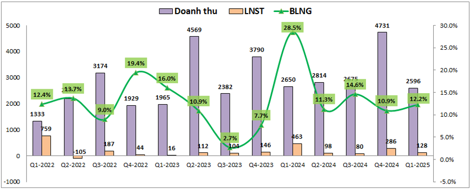 Kết thúc Q1-2025 VCG ghi nhận doanh thu thuần đạt 2,596 tỷ đồng, giảm nhẹ 2% yoy. Lợi nhuận sau thuế ghi nhận 128 tỷ đồng, giảm mạnh 72.4% yoy. Nguyên nhân khiến lợi nhuận sau thuế của VCG giảm mạnh so với cùng kỳ dù cho doanh thu chỉ giảm nhẹ 2% là do mức nền lợi nhuận cùng kỳ Q1-2024 là rất cao với 463 tỷ đồng. (Hình 1)