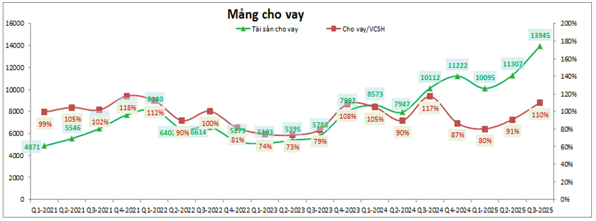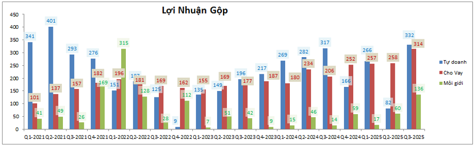 Bóc tách KQKD theo từng mảng chúng ta cũng sẽ thấy các mảng kinh doanh chính đều tăng trưởng tốt nhưng chưa thực sự bứt phá. Đáng chú ý nhất có lẽ là mảng tự doanh đã tốt trở lại rất nhanh sau Q2 gặp vô vàn khó khăn từ căng thẳng thuế quan. Trong khi đó mảng cho vay vẫn đang từng bước tiến lên vững chãi sau mỗi quý nhưng không quá nhanh. (Hình 2)