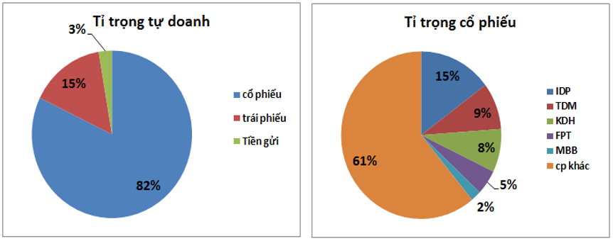 Các cổ phiếu đáng chú ý trong danh mục như IDP, TDM, KDH, FPT, MBB chiếm tổng 39% và còn 61% là các cổ phiếu khác. Trong danh mục 5 cổ phiếu chính thì chúng ta có thể thấy ngoài MBB và phần nào là KDH có diễn biến tích cực còn 3 cổ phiếu còn lại thì khá ảm đạm và thậm chí còn giảm (FPT) trong giai đoạn vừa qua dù thị trường chung tích cực. Thực tế nhìn biểu đồ lợi nhuận mảng tự doanh ở phần trên chúng ta cũng có thể thấy kết quả kinh doanh mảng tự doanh của VCI không quá bứt phá trong Q3 dù cho tỉ trọng cổ phiếu lên tới 82%. Nếu nhìn sang các công ty chứng khoán khác có tự doanh cổ phiếu như VPBS, VIX, SHS, … chúng ta sẽ thấy rõ hơn bức tranh này. Điều này có nghĩa danh mục tự doanh của VCI đang chưa thực sự tốt ở quý 3 và hiện tại cũng đang tương tự vậy.