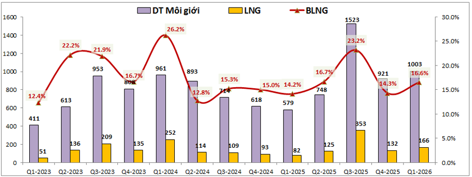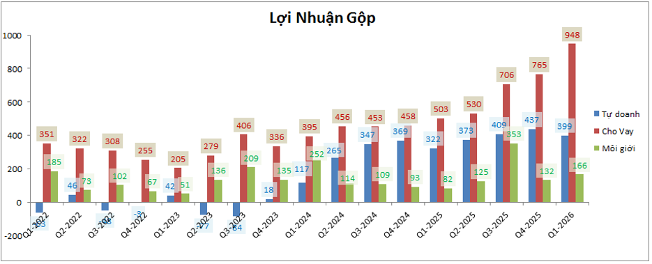 Trung bình mỗi quý mảng môi giới vẫn đóng góp cho VCK khoảng 150 tỷ đồng và cũng chưa ghi nhận lỗ dù thị trường chung khó khăn. Trong Q1-2026 mảng môi giới ghi nhận tăng trưởng tốt với mức 102% về lợi nhuận so với cùng kỳ. Tuy nhiên với mức nền cao trong 3 quý tới chúng tôi cho rằng mức tăng trưởng sẽ giảm xuống chỉ còn trung bình quanh ngưỡng 15-20% mỗi quý. Cả năm 2026 mức tăng trưởng so với 2025 dự kiến sẽ nằm trong khoảng 20-25%.