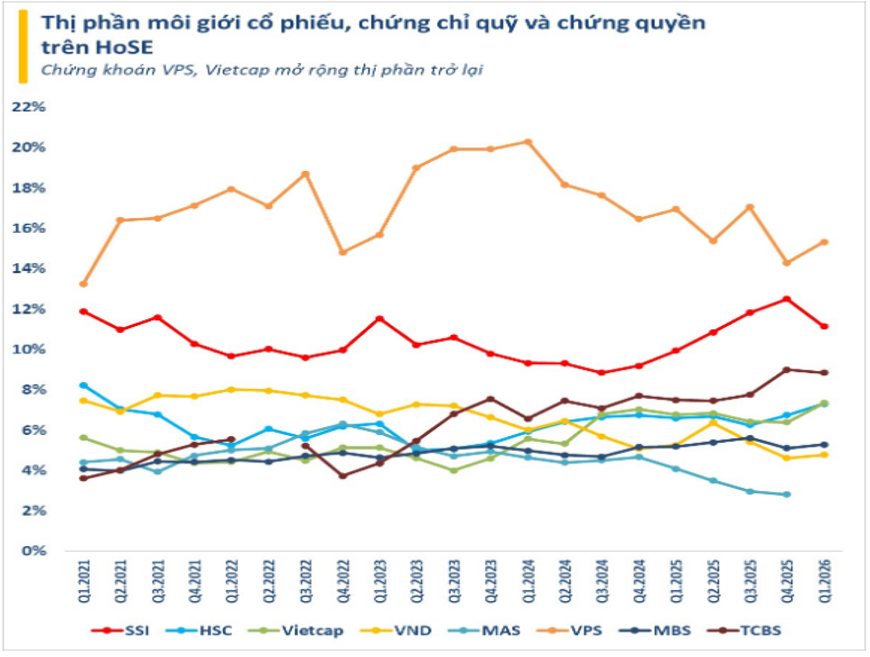 Trong Q4-2025 nhờ việc lên sàn và tiến hành tăng vốn khủng đã giúp cho VCK có nguồn tiền lớn để phục vụ cho mảng cho vay ký quỹ của mình. Chưa kể, quá trình tăng vốn cũng giúp gia tăng dư địa tăng trưởng nhờ nới rộng trần cho vay cho phép lên mức cao hơn. Hiện tại tỷ lệ cho vay/VCSH của VCK tính tới cuối Q1-2026 mới chỉ ở mức 101% (thấp hơn mức 152% cùng kỳ dù tài sản cho vay tăng mạnh). Điều này giúp cho mảng cho vay có thể duy trì tăng trưởng tốt trong các quý tới dù chưa có kế hoạch tăng thêm vốn trong 2026. Thêm động lực hỗ trợ cho VCK khi mà thị phần môi giới của công ty trong Q1-2026 đã tăng trở lại sau sụt giảm tại nhiều quý gần đây. (Hình 5)