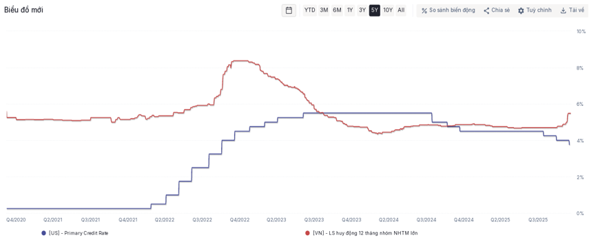 Đầu tiên là bối cảnh về lãi suất, trong giai đoạn mà FED đang hạ lãi suất điều hành của mình từ giữa 2025 tới nay thì Việt Nam lại bất ngờ tăng trở lại lãi suất vào cuối năm 2025 dù trước đó đã chủ động hạ lãi suất trước FED để đón đầu giai đoạn bơm tiền trở lại của FED nhằm thúc đẩy kinh tế tăng trưởng, đón bắt được cơ hội trong các năm tiếp theo.