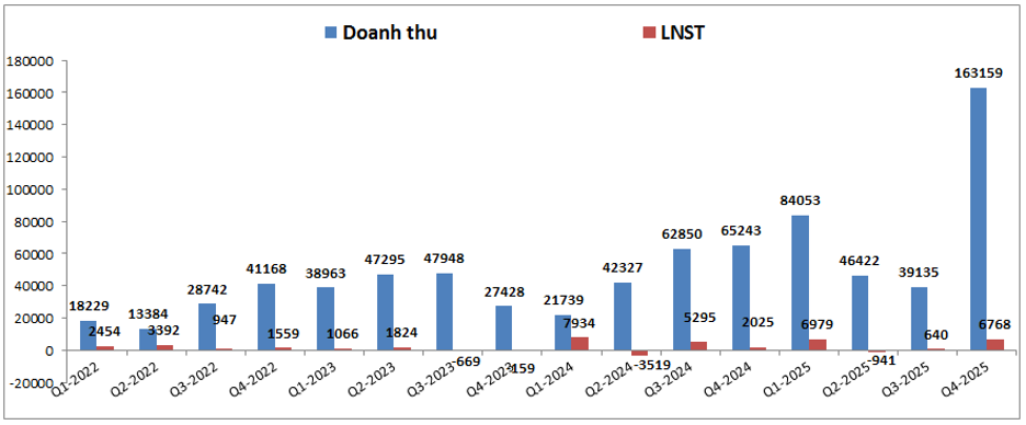 Trước tiên chúng ta cũng sẽ cập nhật nhanh KQKD của công ty để xem tình trạng kinh doanh ra sao, các chỉ số tài chính trên bctc đang như thế nào. Từ đó có thể phần nào biết được mục tiêu, động lực và kế hoạch của công ty trong các năm tới. Kết thúc Q4-2025 VIC ghi nhận KQKD tăng đột biến với doanh thu lên tới hơn 163k tỷ đồng, tăng tới 2.5 lần so với cùng kỳ. Lợi nhuận sau thuế ghi nhận 6,768 tỷ đồng, tăng 3.34 lần yoy. (Hình 1)