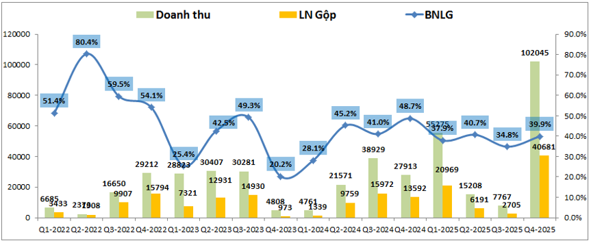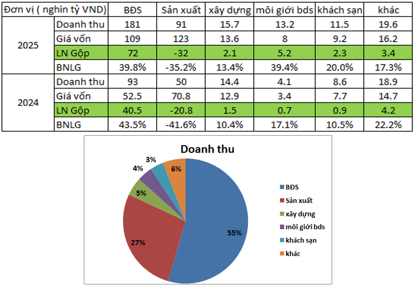 - Môi giới BĐS: Đây cũng là mảng chủ yếu hoạt động phục vụ cho việc bán các sản phẩm của công ty để tối ưu hóa lợi nhuận. Với chính sách hỗ trợ lãi suất mua nhà mạnh mẽ vừa ra vào tháng 3/2026 dự kiến sẽ giúp cho doanh số bán hàng vẫn duy trì ở mức cao trong năm 2026 dù thị trường chúng ngành BĐS vẫn còn nhiều khó khăn. Trong năm 2025 mảng môi giới ghi nhận doanh thu đạt 13.2k tỷ đồng, lợi nhuận gộp đạt 5.2k tỷ đồng, tăng mạnh so với 2024 và sang 2026 chúng tôi kỳ vọng KQKD của mảng môi giới có thể vẫn duy trì tương tự như 2025 nhờ có thêm sản phẩm mới đưa vào kinh doanh bù cho những khó khăn từ thị trường chung.