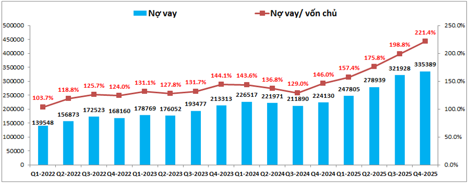 Tiếp theo về tài chính doanh nghiệp. Tính tới cuối Q4-2025, tổng nợ vay của công ty đã tăng lên hơn 335k tỷ đồng, tỷ lệ nợ vay/VCSH cũng tăng lên tới 221%. Đây là mức rất cao nếu so với trung bình ngành. (Hình 3)