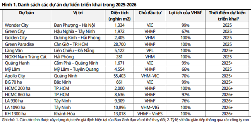 - Xây dựng (Vincons): Đây là công ty con của VHM (sở hữu 100% vốn). KQKD chủ yếu tới từ các dự án của VHM và của các đối tác bán sỉ như Masterise, Capitaland. Trong 2025 doanh thu đạt 15.7k tỷ đồng, lợi nhuận gộp đạt 2.1k tỷ đồng. Dự kiến trong 2026 doanh thu và lợi nhuận sẽ còn tăng thêm nữa khi có nhiều dự án được đưa vào kinh doanh cũng như khối lượng công việc tăng lên. Chúng tôi dự kiến doanh thu và lợi nhuận gộp trong năm 2026 có thể đạt lần lượt 18k tỷ đồng và 3k tỷ đồng.