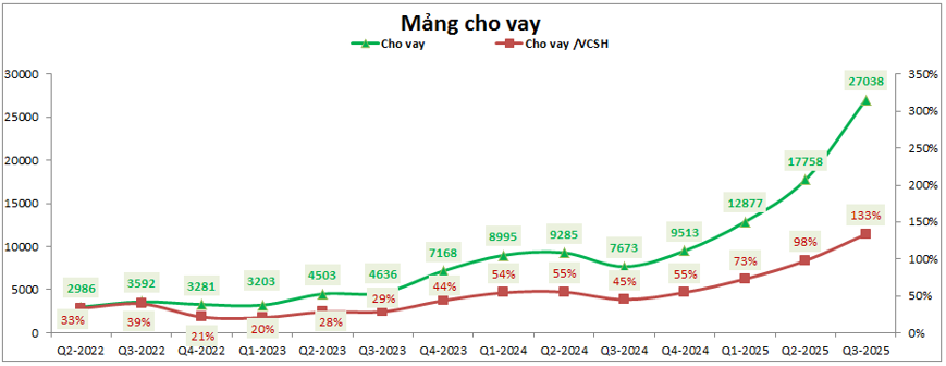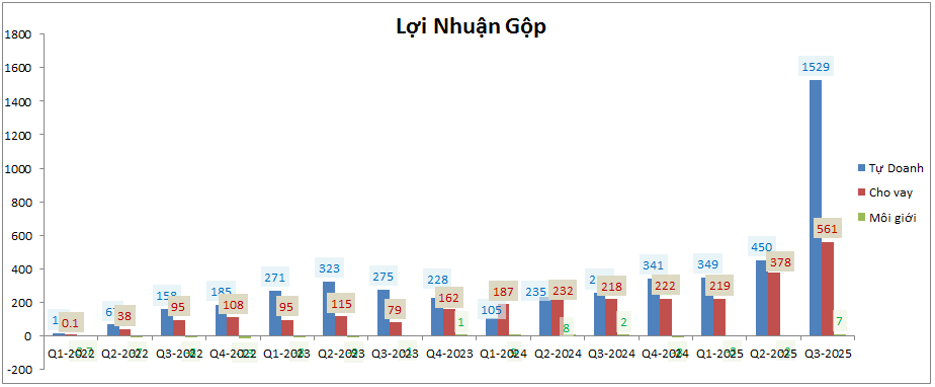 Bóc tách kết quả kinh doanh của từng mảng sẽ thấy 2 mảng chính là cho vay và tự doanh của VPBS để tăng trưởng tốt trong năm 2025, đặc biệt là Q3-2025. Và mảng có đóng góp mạnh nhất vào tăng trưởng của VPBS đó chính là mảng tự doanh với mức tăng 6 lần so với cùng kỳ, mảng cho vay tăng  2.6 lần yoy. Ngoài ra trong Q3 cũng ghi nhận lợi nhuận đột biến từ mảng tư vấn tài chính với 678 tỷ đồng. Chi tiết như hình 2 dưới: