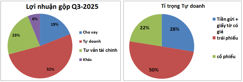 Tính đến cuối Q3-2025 tổng tài sản tự doanh của VPBS đạt 22,263 tỷ đồng, trong đó trái phiếu chiếm tỉ trọng lớn nhất với 50% với 11,094 tỷ đồng. tiếp theo là tiền gửi + giấy tờ có giá chiếm 28% với 6,141 tỷ đồng. Và còn lại là danh mục cổ phiếu chiếm 22% tỉ trọng tự doanh với 4,994 tỷ đồng. Đáng tiếc là VPBS không thuyết minh chi tiết danh mục cổ phiếu của mình nên chúng tôi cũng không thể bóc tách rõ hơn về tiềm năng. Nhưng với việc các lớp tài sản như trái phiếu, tiền gửi mang lại nguồn lợi nhuận ổn định chứ không đột biến mà kết quả kinh doanh trong Q3-2025 đột biến lớn chứng tỏ lợi suất của danh mục cổ phiếu của công ty là hết sức khả quan. Trong Q4-2025 khi tài sản tự doanh tăng lên cũng như thị trường vẫn vận động tốt sau khi được nâng hạng sẽ là động lực để VPBS có thể duy trì được kết quả kinh doanh ấn tượng tương tự như đã làm được trong Q3 của mảng tự doanh.