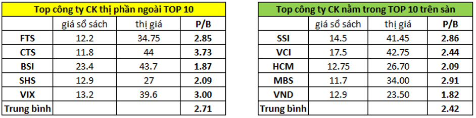 VPBS sẽ chào bán lần đầu với mức giá 33.9k/cp và với giá trị sổ sách khoảng 14.8k/cp sau IPO thì mức định giá theo P/B của công ty là khoảng 2.3 lần. Dưới đây chúng tôi sẽ liệt kê định giá hiện tại của một số công ty cũng thiên về cho vay mà không nằm trong top 10 và cả nằm trong top 10 công ty chứng khoán lớn nhất trên sàn Hose (hiện VPBS không nằm trong top 10 công ty có thị phần môi giới lớn nhất trên sàn) để xem mức độ tương quan về định giá của VPBS. (Hình 5)